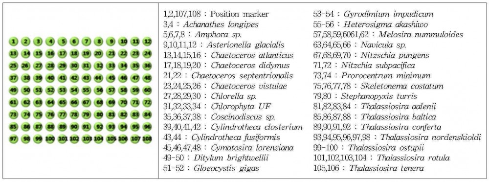 본 발명은 한국 연안에 서식하는 규조류의 종(species)을 판별하는 방법과, 이를 위한 규조류의 종 판별용 폴리뉴클레오티드 프로브, DNA 칩 및 키트에 대한 것으로, 규조류에서 추출한 DNA에 대해 중합효소연쇄반응(PCR)을 수행하여 PCR 산물을 얻는 단계; 상기 PCR 산물을, 서열번호 3 내지 서열번호 51 중 하나 이상의 각 DNA 서열과 동일하거나 그에 상보적인(complementary) 염기서열을 각각 포함하는 프로브에 결합시키는 단계; 및, 상기 결합 여부에 따라 상기 규조류가 속하는 종을 판별하는 단계;를 포함하는 것이 특징이다. 이러한 본 발명은 다양한 규조류 종의 단염기다형성(single nucleotide polymorphism, SNPs)을 기반으로, 한국 연안에 서식하는 규조류에 대한 유전자형을 분석하고, 간단하고 신속, 정확하게 그것의 종을 판별할 수 있는 효과가 있다.
