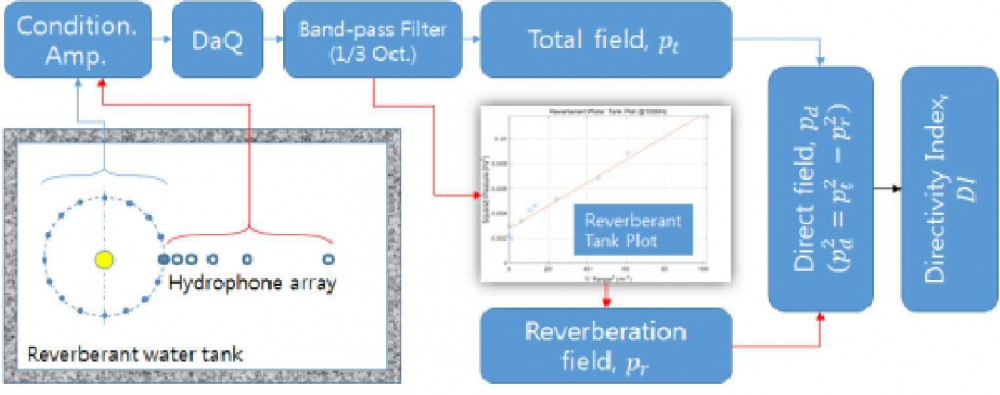 본 발명은 잔향수조에서의 음원 지향성 산정에 적용하는 간이추정방법에 관한 것으로, 확산음향장인 잔향수조에서의 음원 지향성 산정에 적용하는 간이추정방법으로서 상기 음원 지향성 간이추정기법은 수중청음기를 이용한 신호 계측, 신호증폭, 음압 데이터 획득(data acquisition, DaQ), 광대역 필터 적용, 전체 음압 및 잔향수조도 기반의 잔향음압 산정, 직접음압 산정, 지향성 지수 산정 절차를 포함하는 것으로, 본발명은 잔향수조 내 단극음원과 쌍극음원에 대한 수치시뮬레이션을 수행하여, 수중음원에 대한 정도 높은 지향성 산정이 가능한 현저한 효과가 있다.